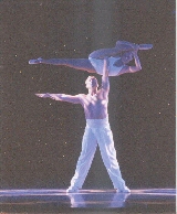 Adagio, combines the strength and agility of gymnatics with the aesthetic and fluidity of classical dance. Also known in the Ballroom world as 'Cabaret', with one of the most famous exponents in this discipline being the 'Savoys', who were World Champions. Adagio, is mainly concerned with lifting- progressing from small waist high flips and spins up to full one arm balances, throws and heart stopping catches. The male partner obviously has to possess great strength and technique in order to effortlessly propel his partner up into the air (Well thats how it should appear) Equally the female counterpart, should be strong, flexible, elegant and fearless, thus enabling her to be lifted with ease and poise without indication of the inner stresses and strains. It would certainly make for an interesting piece should the realities be allowed to show!!!!! The lifts, spins and tricks are then interspersed with dance moves and styles of your choice, to give the work its own particular flavour, depending on the context of the show or event that you are involved in.The most traditional Adagio piece is the 'Apache' - where the French sailor throws around his Prostitute (Nice work if you can get it!!)