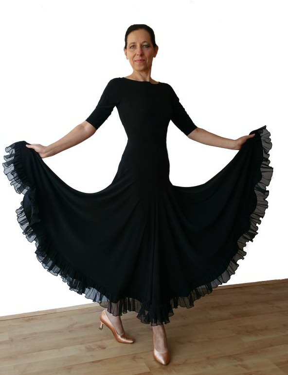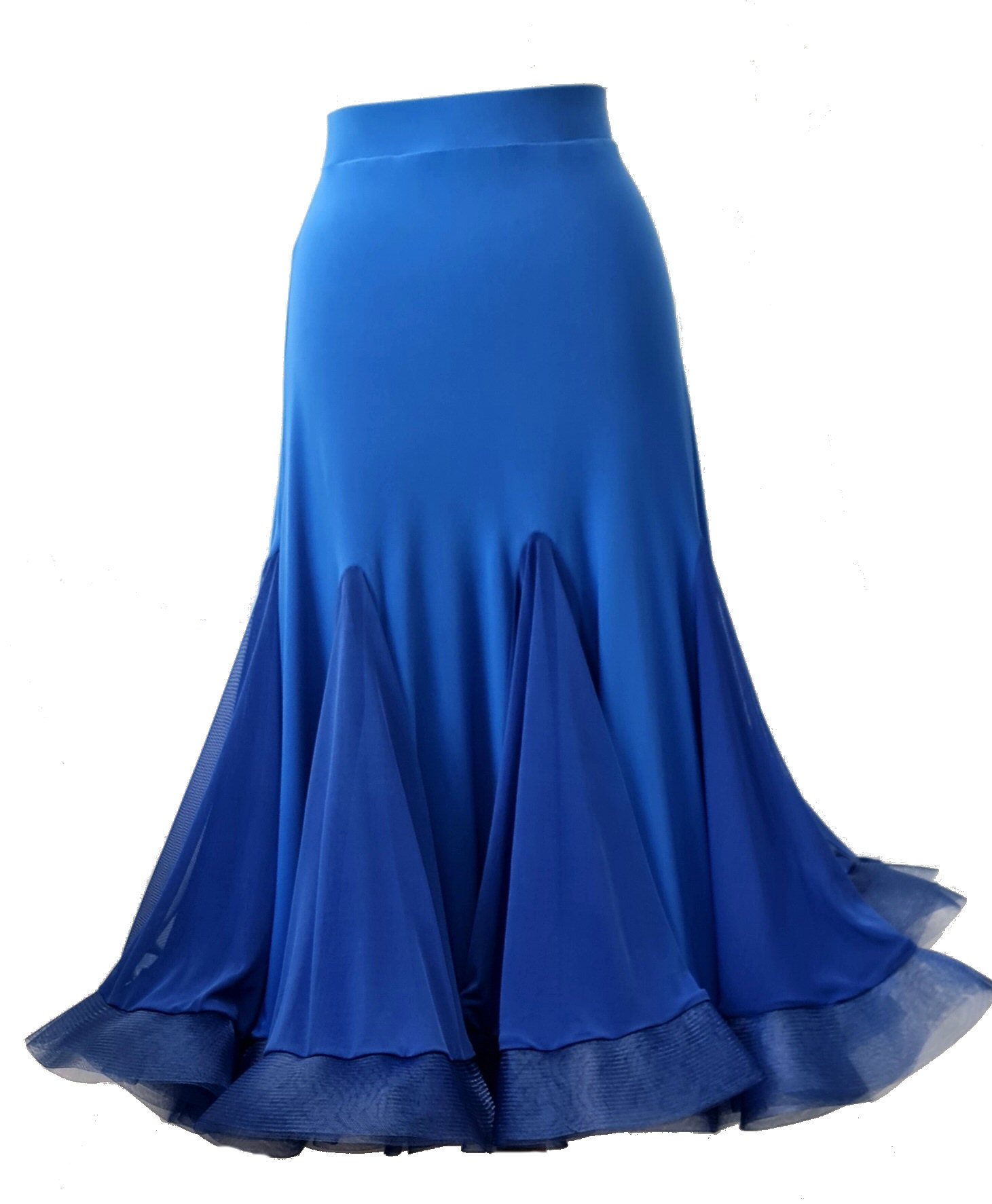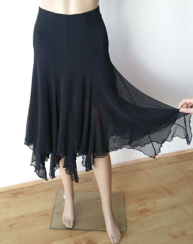 Magnificent flow ballroom skirt made of four panels and finished with mesh. Body friendly stretch crepe. Very easy care: Machine washable, dries quickly and does not require iroining. Does not crease.